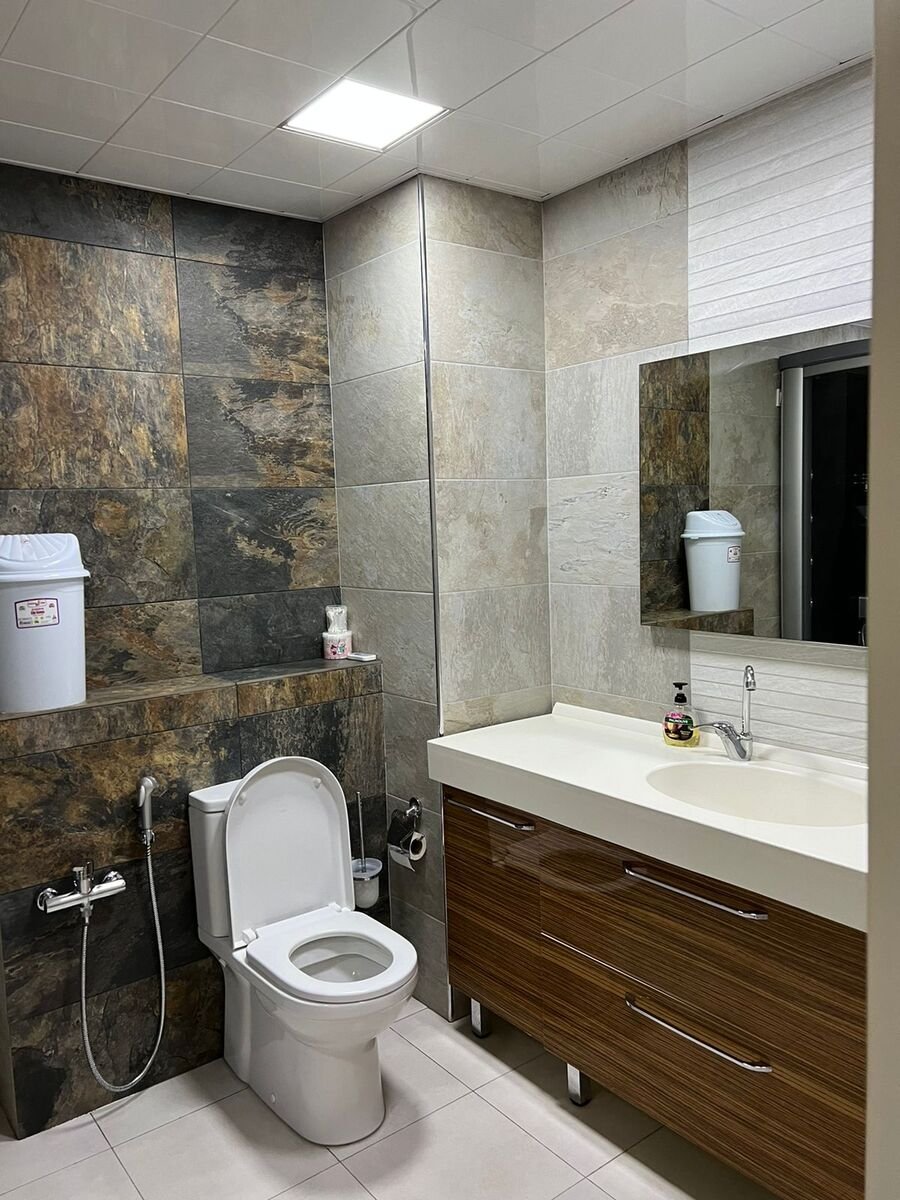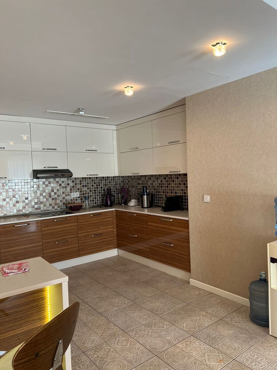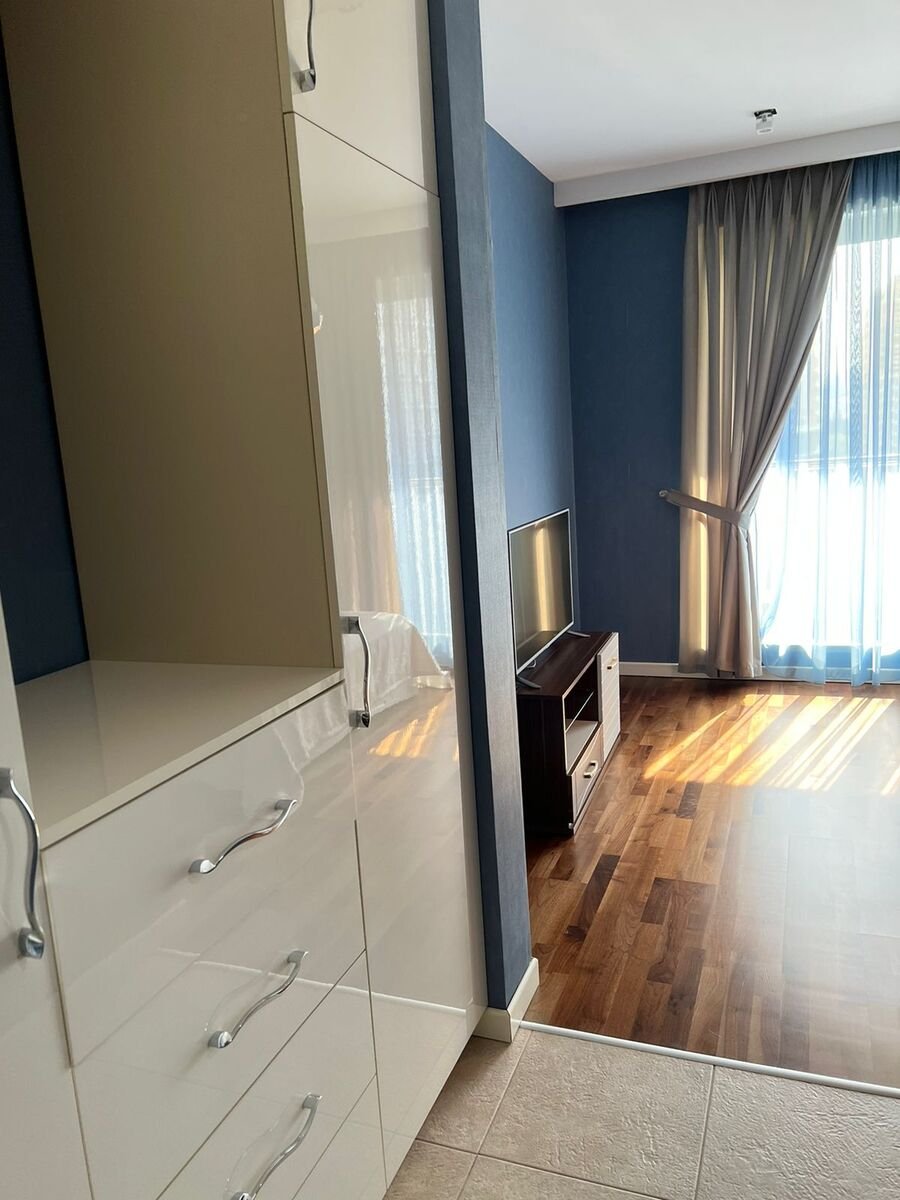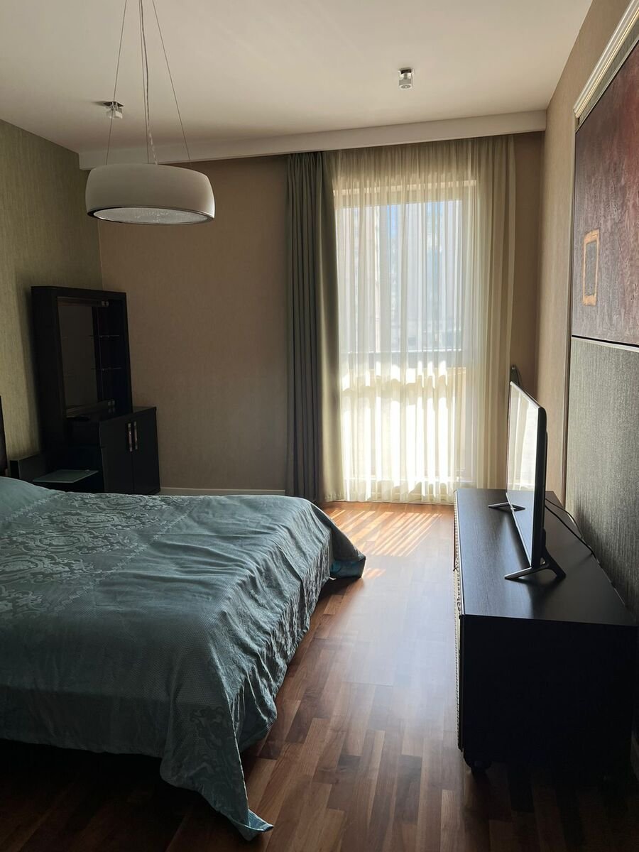The apartment is fully furnished: 2 bedrooms, 1 living room + kitchen, 3 bathrooms. A/с, washing machine and dishwasher. The building is close to kindergardens, schools, supermarkets and banks. 24-hour security is available. Building service included. Discount is possible.